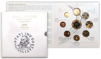 tečajni evrokovanci s slovensko nacionalno stranjo in dvokovinski zbirateljski kovanec za 3 evre, izdan ob predsedovanju EU.
