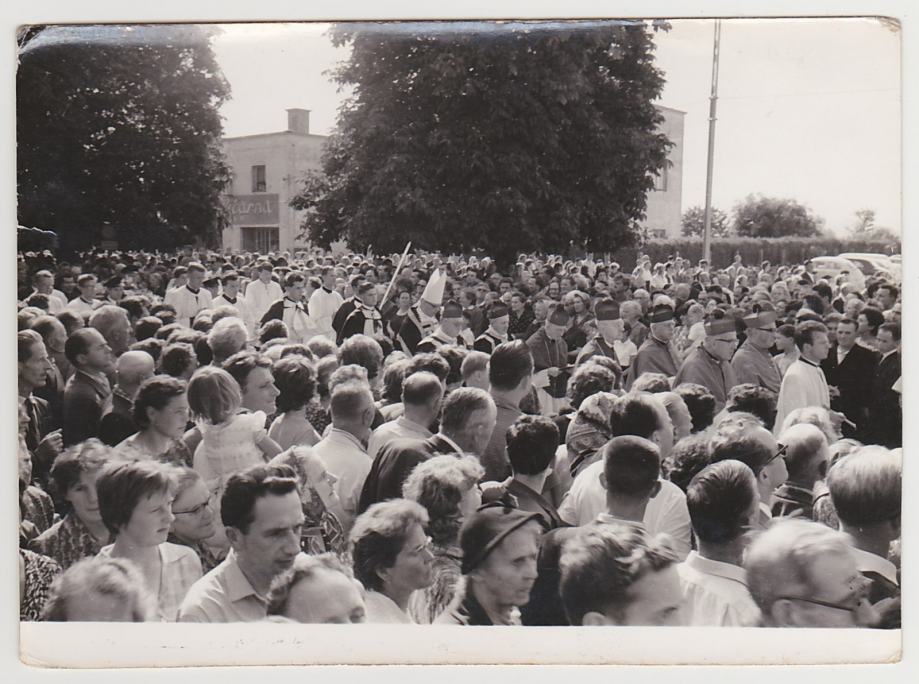 Fotograf Erjavec. V ozadju cvetličarna. Škof. Stična mladih, procesija? Prodaja se fotografija s slike. Kupec plača poštnino.