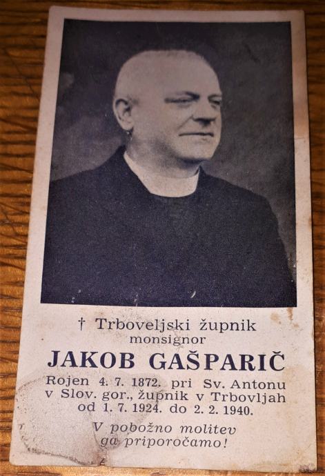 Prodam zanimiv lot dveh razglednic in podobice ob smrti trboveljskega župnika Jakoba Gašpariča; na zadnji razglednici sta lepo vidna pripadnika fantovskih odsekov, ki stojita ob pokojnem župniku.