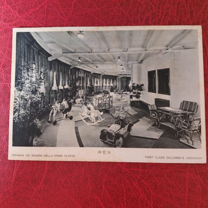 Stara razglednica otroške verande 1. klase na ladji Rex, takrat najmodernejše in najhitrejše potniške ladje na svetu, potopljene pri Kopru leta 1944. Ni potovala.