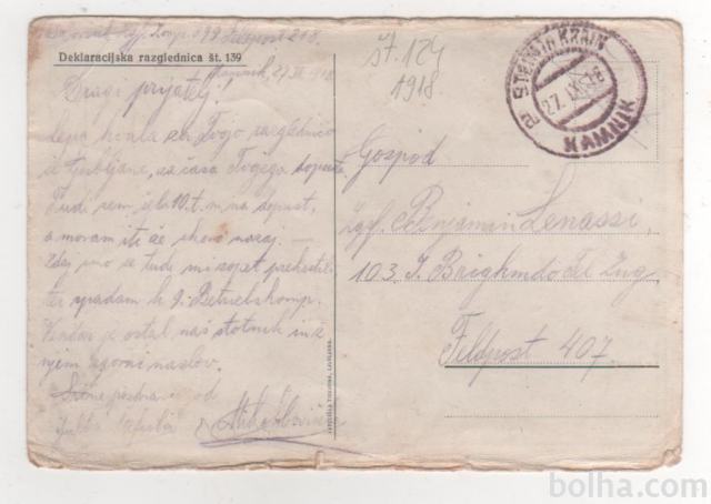 DEKLARACIJSKA RAZGLEDNICA ŠT.139, POSLANA Z VOJNO POŠTO!