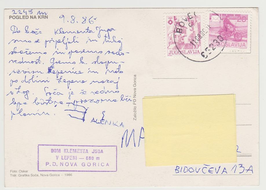 Založilo PD Nova Gorica. Prodaja se razglednica s slike. Kupec plača poštnino.