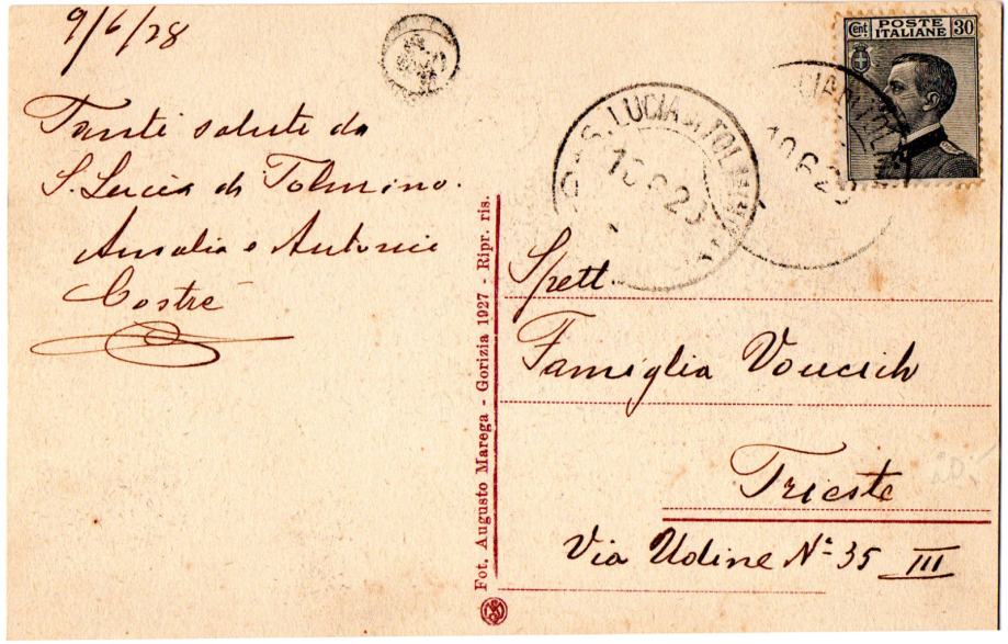 Prodam staro razglednico S. LUCIA (Most na Soči - Sv. Lucija ob Soči) iz obdobja italijanske okupacije - sotok Soče in Idrijce. Založil Augusto Marega, Gorizia 1927. Oddana na pošti S. LUCIA DI TOLMINO, 10.6.1928 za Trst.