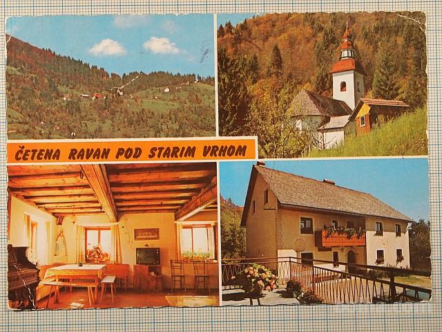 Razglednica ČETENA RAVAN POD STARIM VRHOM, potovala 1979. Četena Ravan je vas nad Poljansko dolino v neposredni bližini smučarskega centra Stari vrh v Občini Gorenja vas - Poljane. Je rojstna vas prvega slovenskega jezikoslovca Gregorja Kreka.