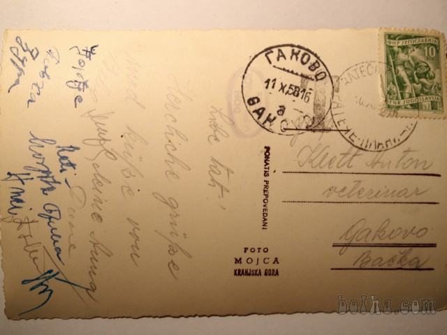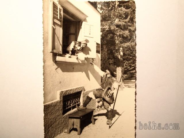 Razglednica KRANJSKA GORA, gorenjska narodna noša - podokničar, potovala 1958, z znamko.