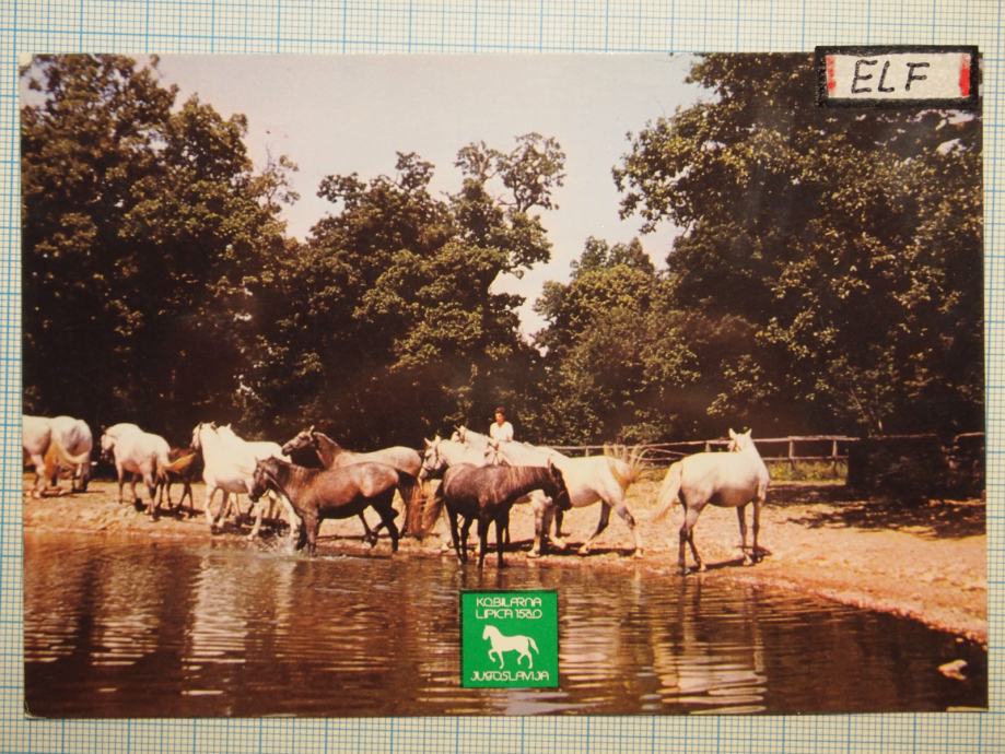 Razglednica LIPICA, KOBILE NA NAPAJALIŠČU. Potovala 1984.