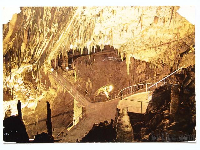 Razglednica POSTOJNSKA JAMA, potovala 1976, z znamko, na zgornjih vogalih je poškodovana, ker je bila prilepljena s selotejpom.