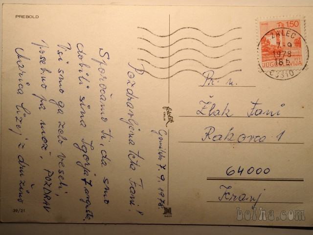 Razglednica PREBOLD, potovala 1978, z znamko.