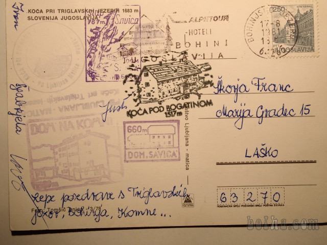 Razglednica KOČA PRI TRIGLAVSKIH JEZERIH, potovala 1981, z znamko in žigi.