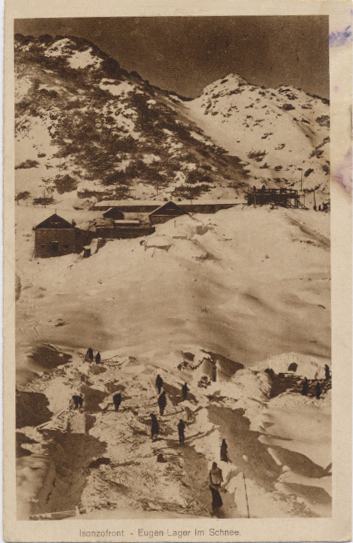 Prodam staro razglednico ISONZOFRONT - Eugen Lager (v snegu) - avstro-ogrski vojaški tabor na planini Na kraju, iz obdobja prve svetovne vojne, neodposlana.