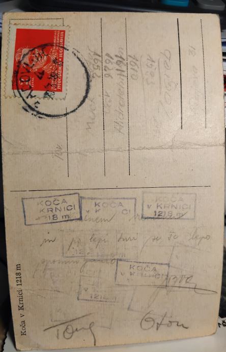 Stara razglednica KOČA V KRNICI 1218 m z znamko iz leta 1945 in žigi iz koče. Poslano Muck Petru -avtorju knjige Spomini starega alpinista, ki je takrat hodil v Zagrebu na srednjo šolo Tehnikum. Pošljem po pošti na stroške kupca.