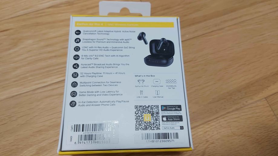 Izdelek pride v originalni embalaži in so pripravljene na takojšnjo uporabo. Omogočajo več kot 10 ur neprekinjene uporabe, z 52 dodatnimi urami s polnilno škatlico in vsebujejo 5 različnih velikosti čepkov za udobno namestitev.