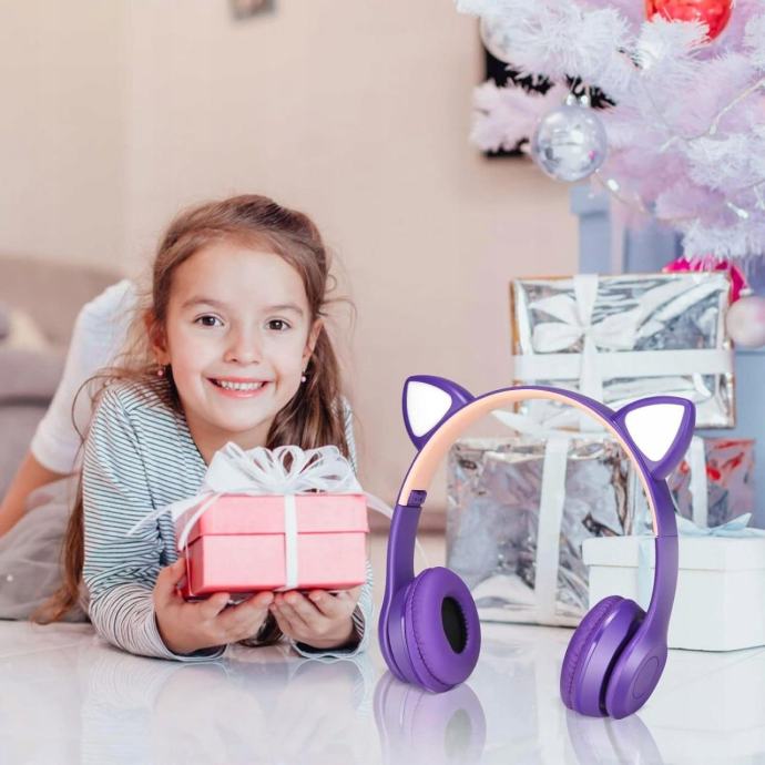 Odkrijte čarobnost glasbe z našimi slušalkami Bluetooth RGB z mačjimi ušesi v vijolični barvi!