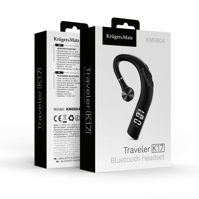 Brezžične slušalke Kruger&Matz Traveler K17 so idealna rešitev za tiste, ki cenijo udobje, mobilnost in zanesljivo povezljivost. Zaradi ergonomske in lahke zasnove so idealne za dolge klice in potovanja. Tehnologija Bluetooth 5.2 zagotavlja stabilno povezavo in širok doseg.