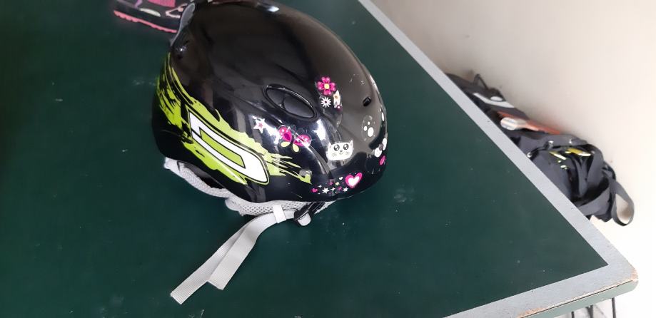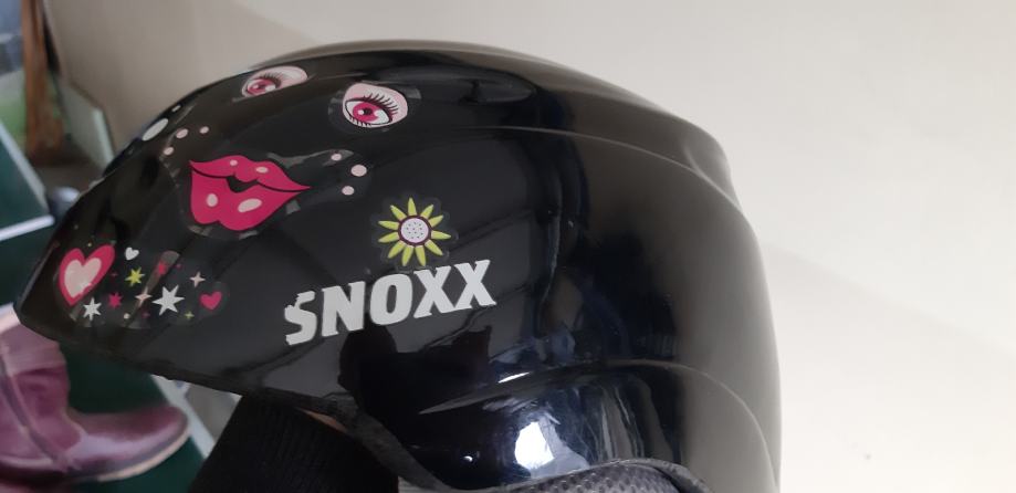 Prodajam rabljeno otroško smučarsko čelado znamke Snoxx v črni barvi z ljubkimi dekorativnimi elementi. Čelada je velikosti XS in primerna za obseg glave 45-54 cm. Odlična izbira za varnost na snežnih strminah.