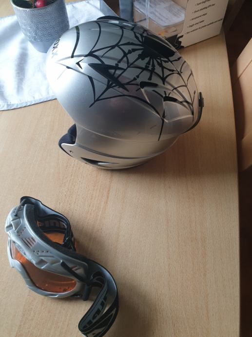 Smučarska čelada znamke SNOXX s pajkovim vzorcem. vključuje tudi smučarska očala