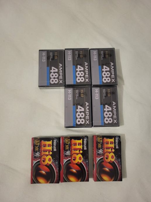 Prodajam popolnoma nove in neuporabljene avdio kasete znamk AMPEX in MAXELL. V kompletu je pet AMPEX 488 kaset in tri Maxell Hi8 kasete, vse so originalno zapakirane in pripravljene za uporabo. Idealno za zbiratelje ali ljubitelje retro avdio opreme.