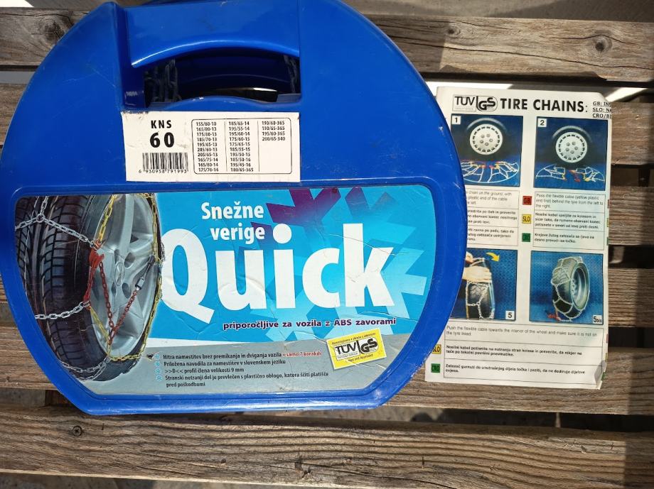 Prodam rabljene snežne verige QUICK, KNS 60. Dimenzije pnevmatik razvidne iz fotografije.