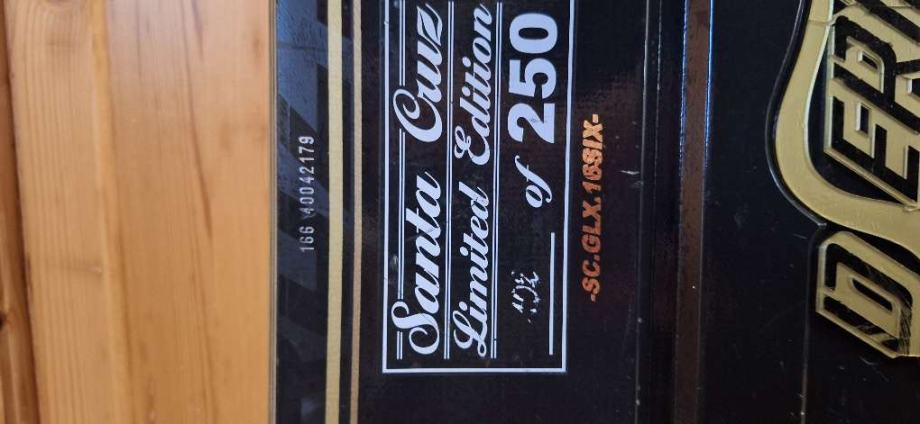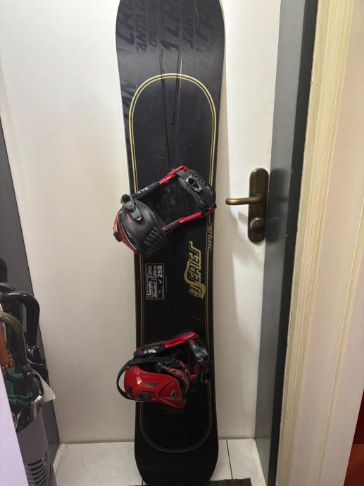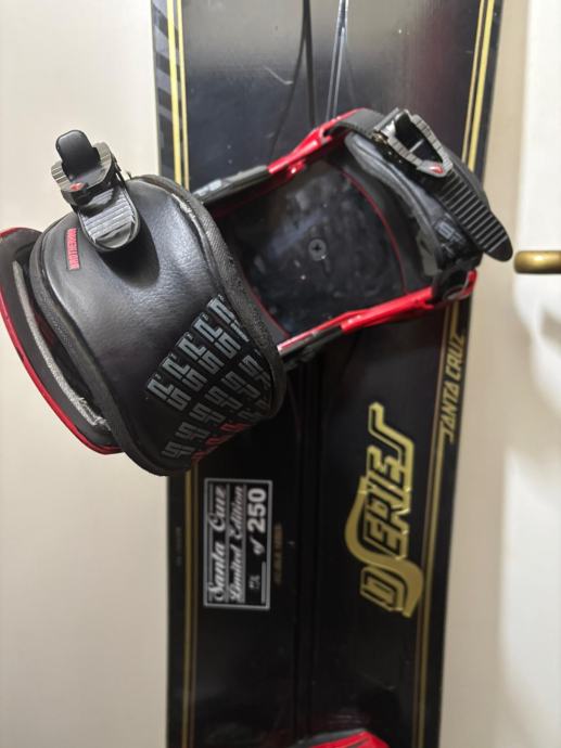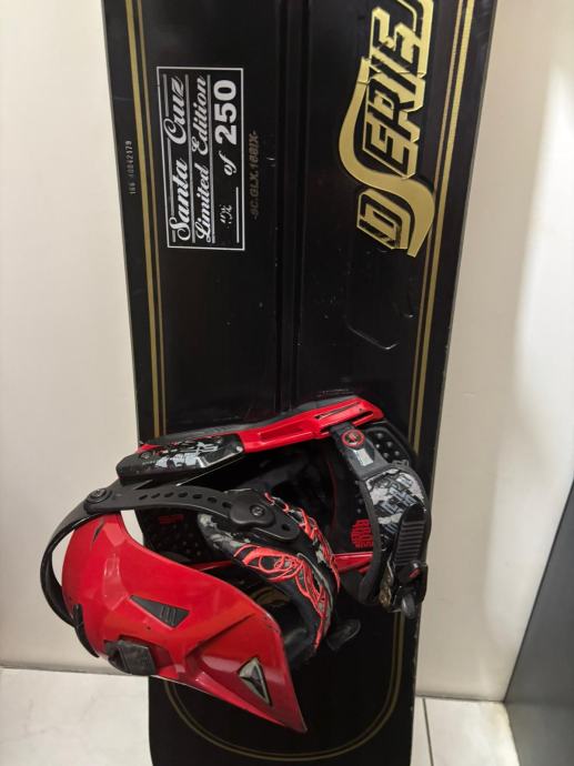 Prodam rabljen a odlično ohranjen snowboard znamke Santa Cruz, model GLX D-Series, Limited Edition, v dolžini 166 cm. Snowboard je del posebne izdaje, saj je bilo izdelanih vsega skupaj samo 250 kosov, in ta snowboard je št. 102. Ima eno izmed najboljših in izjemno hitrih drsnih površin, tako da je hitrejši kot marsikatere smučke. Vezi so velikost L/XL, primerne za čevlje od 43 navzgor.
