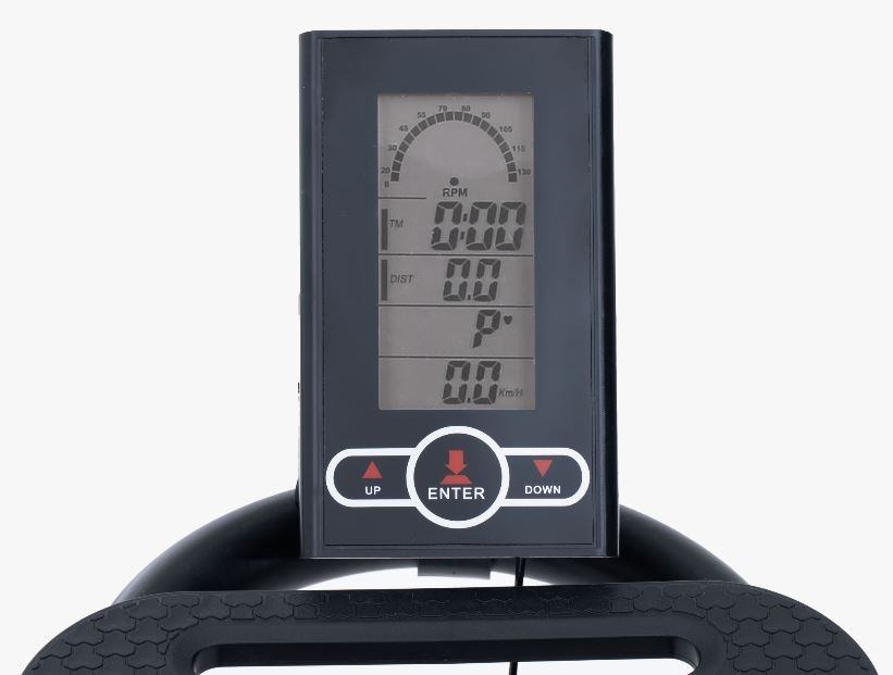 LCD zaslon, ki kaže čas, hitrost, razdaljo, kalorije, pulz, RPM