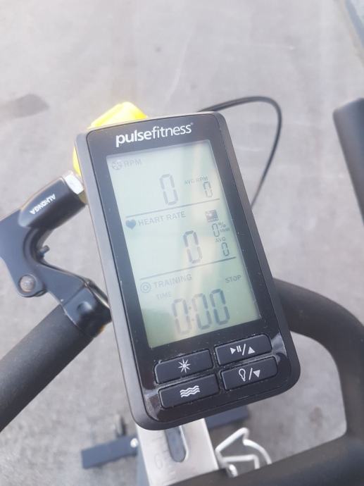 Podatki na ekranu: čas vadbe, hitrost, število obratov, prevoženo razdaljo ter srčni utrip.