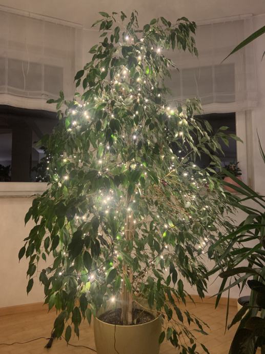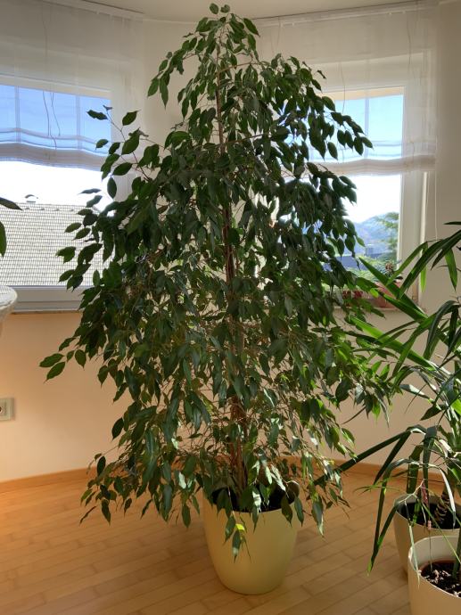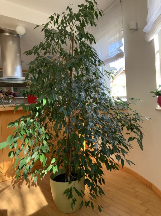 Prodam zelo košat in v obliko drevesa raščen fikus Benjamin. Visok je 200 cm + 35 cm (korenine) in širok 150 cm.