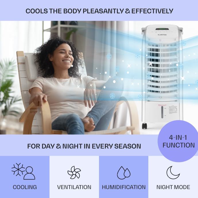 Naprava Klarstein Maxfresh ima tri različne načine delovanja: običajni način, naravni način, ki simulira naraščanje in upadanje jakosti vetra, in nočni način, ki postopoma zmanjšuje hitrost vetra, dokler se popolnoma ne izklopi. V kombinaciji s funkcijo ohlajevalnika zraka izhlapevanje vode poveča učinek hlajenja. V rezervoar lahko napolnite do 6 litrov vode za daljši čas delovanja, dva zamenljiva hladilna vložka pa pomagata še dodatno znižati temperaturo. Rezervoar za vodo je mogoče v celoti odstraniti za lažje polnjenje, čiščenje in praznjenje.