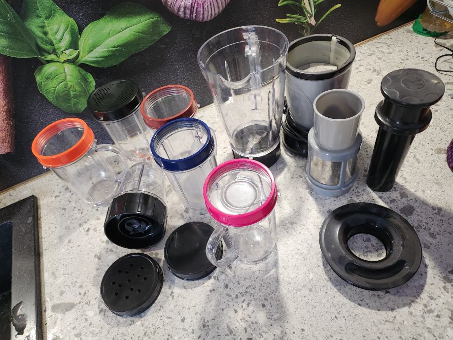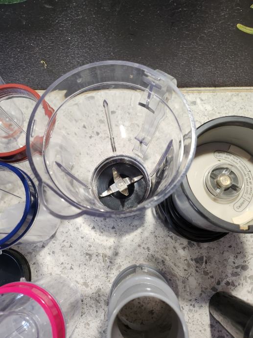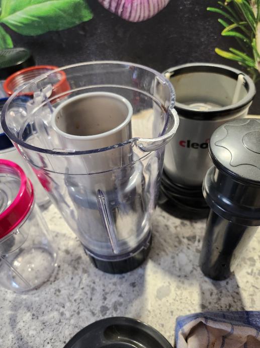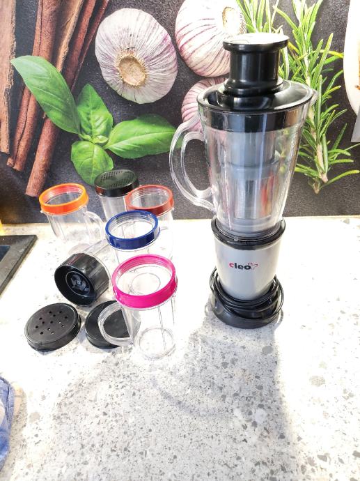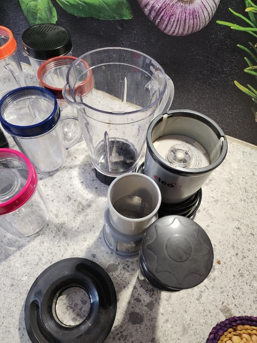 Mešalnik omogoča mešanje napitkov, juh, omak in pijač. Ima 5 kozarcev in različne nastavke ter ustrezne pokrove. Lahko rečem skoraj NOV, ker je samo enkrat sproban.