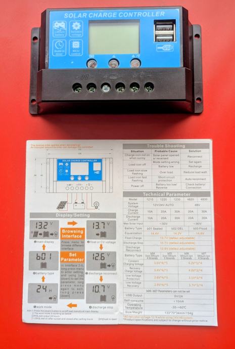 Solarni regulator 12/24 V, 20 A, 2x Usb.