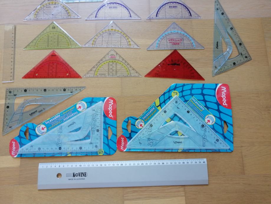 Prodam večinoma nove geotrikotnike in ravnila vseh velikosti. Majhni so 0,50€ večji pa 2€. Geotrikotnik, ravnilo, Za več info:070 379 679.