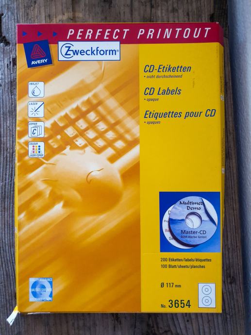 Prodam nalepke Zweckform 3654 za CD / CD-rom / DVD, 199 nalepk (100 listov po 2 nalepki), premer 117 mm.