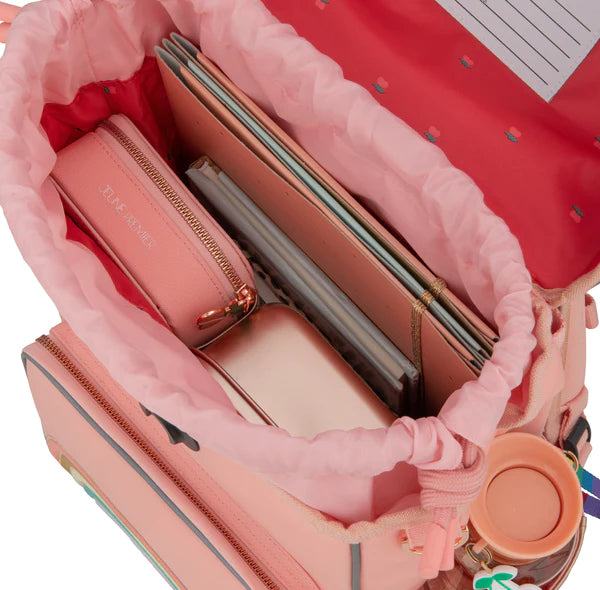 Šolska torba ima glaven velik predal, katerega vsebina je dodatno zaščitena s sistemom vrvic, razdeljen pa je na dva predela v katera bodo otroci lahko pospravili vse zvezke in ostale šolske potrebšine. V notranjosti ima posebaj tudi oblazinjen predel za prenosni računalnik.