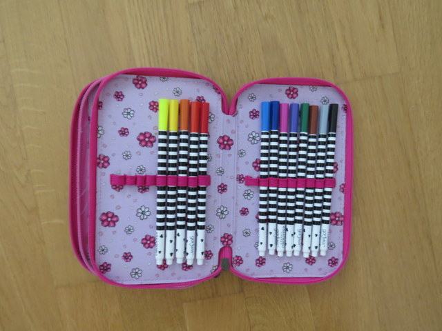 Prodam večnadstropno peresnico (trije zavihki) skupaj z ravnilom ter rabljenimi barvicami in flomastri, znamke SANTORO,