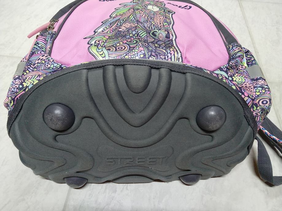 Dno je plastično, da torba ne pade, temveč ostane na mestu, hrbtišče pa je v celoti oblazinjeno. Ob straneh ima odsevne trakove.