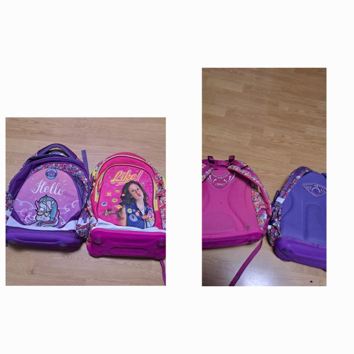 Šolski torbi za prvo triado, ohranjeni. 3 predali in 2 stranska žepa za npr. bidon. Ergonomsko oblikovano hrbtišče.