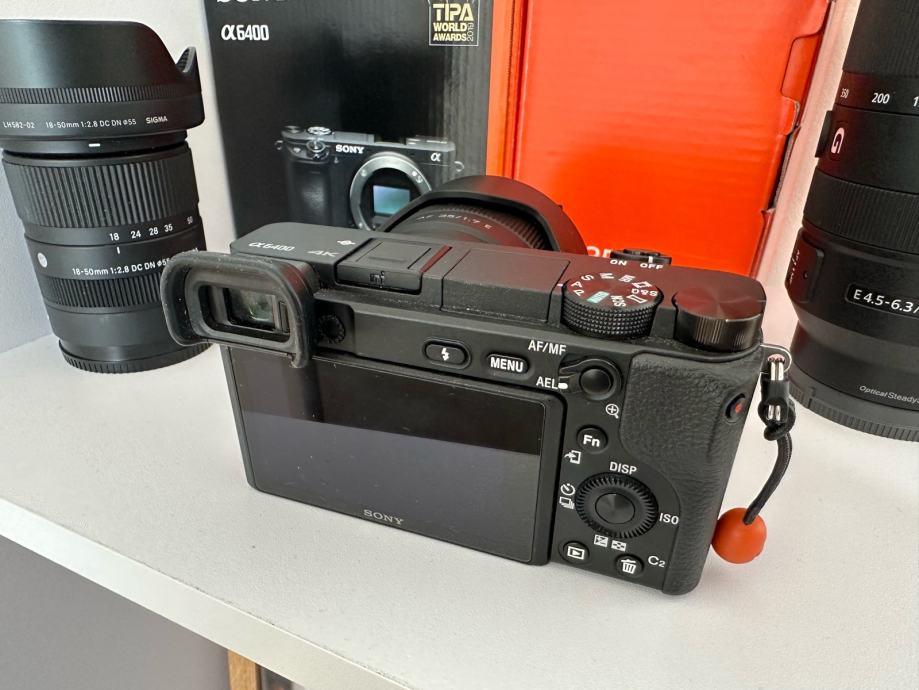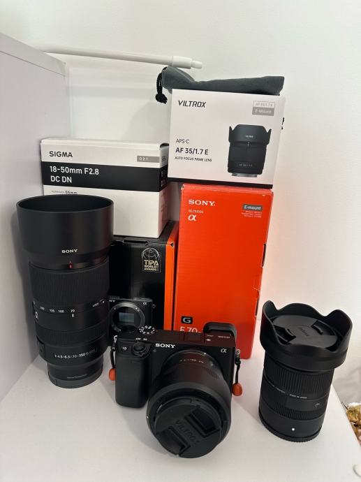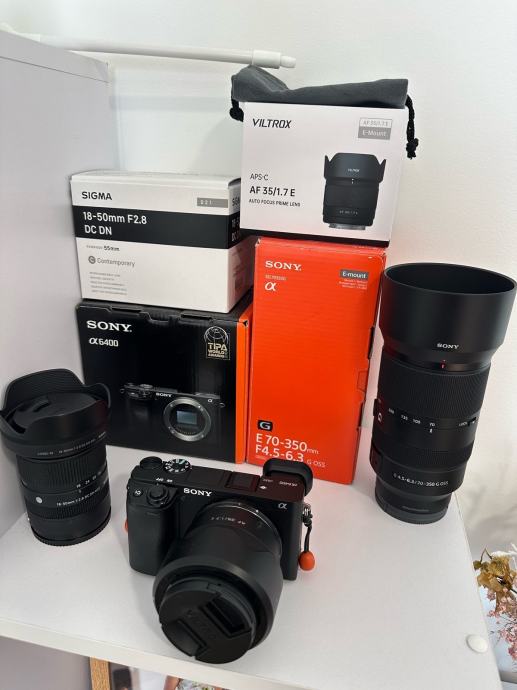 Prodajam praktično nov fotoaparat Sony A6400 v kompletu s tremi objektivi. Paket vključuje Sigma 18-50mm F2.8 DC DN, Sony objektiv 70-350 mm f4.5-6.3 ,Viltrox AF 35/1.7 E, vsi so v odličnem stanju. Fotoaparat je malo rabljen in deluje brezhibno. Manj kot 4000 posnetkov, kupljen marca letos. Prodajam ker premalo uporabljam. Vsi objektivi imajo UV filtre za zascito(hoya), fotoaparat ima ze od nakupa naprej na ekranu zascitno šipco. Zraven tudi dodatna baterija in hitri polnilec za 2 bateriji.