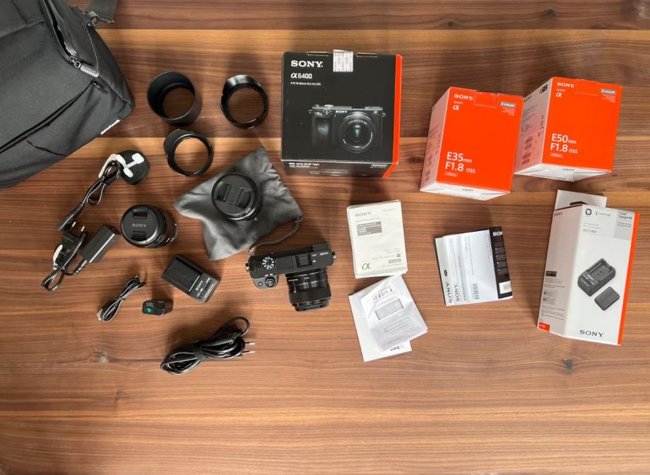 Prodajam svojo kamero SONY a6400 skupaj s tremi hitrimi fiksnimi objektivi in vsemi dodatki, ki jih vidite na fotografijah.