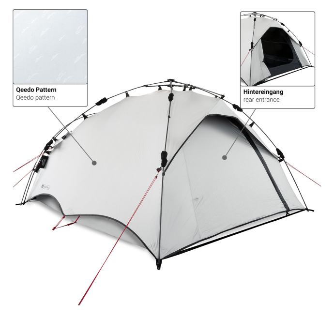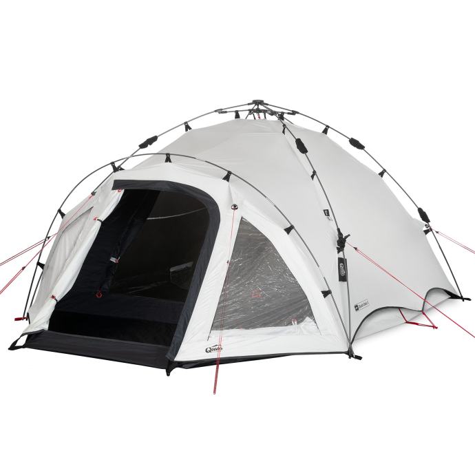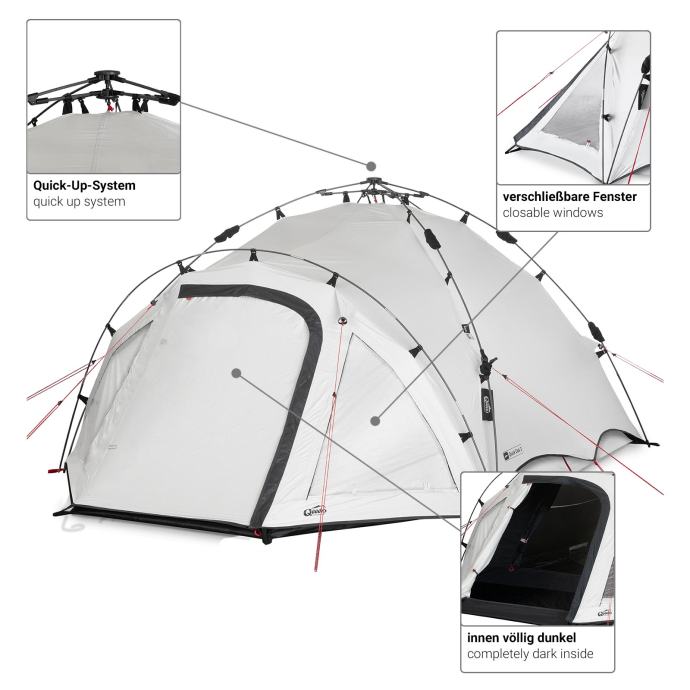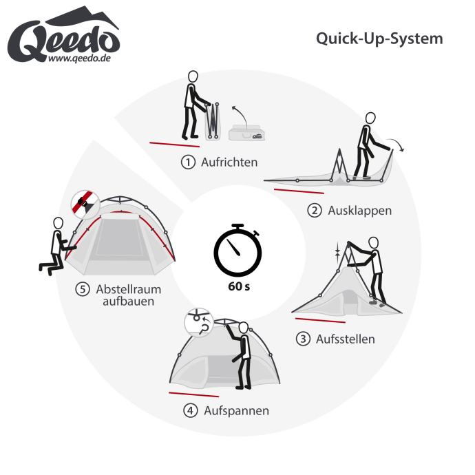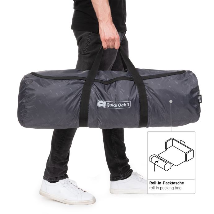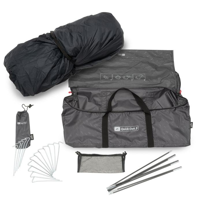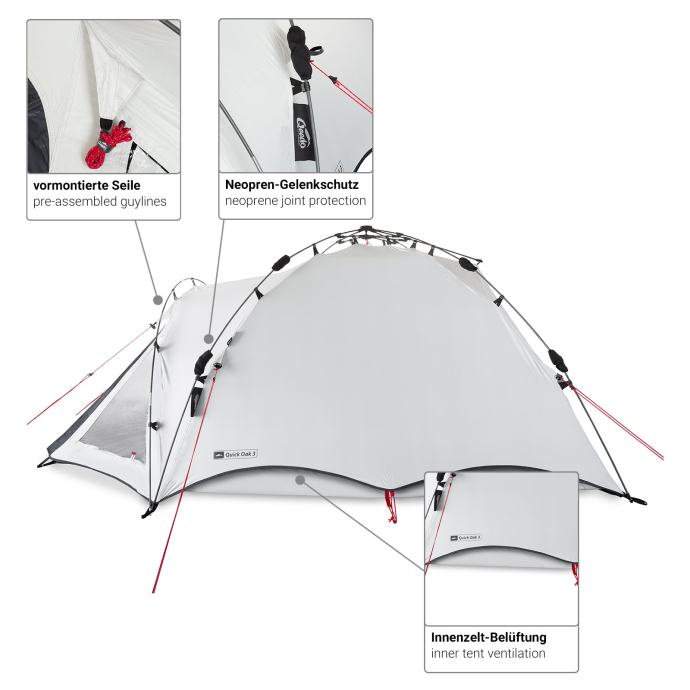 Quick Oak 3 navdušuje tudi z inovativnim sistemom za hitro montažo, sistemom Quick-Up podjetja Qeedo, ki deluje podobno kot dežnik. To pomeni, da lahko Quick Oak 3 postavite in razstavite v nekaj sekundah, brez motečega sestavljanja palic, postavljanja spalnice ali prekrivanja s platnom šotora. Quick Oak 3 je rešitev vse v enem, ker je notranji šotor že pritrjen na sistem. Poleg notranje spalnice ima šotor prostoren predprostor (220 x 80 cm) s panoramskimi okni, katere se lahko zapre in nepremočljiv talni del. Vrata ima spredaj in zadaj, poleg tega ima stropno in stransko zračenje. Na vhodu v spalnico je komarnik. Velikost zloženega šotora je 80 x 24 x 24 cm in težka cca 6,6 kg, kar je zelo pomembno za backpack, motoristična in ostala potovanja z malo prtljage in potrebo po hitri postavitvi prenočišča. Zato se samo sprostite in uživajte.