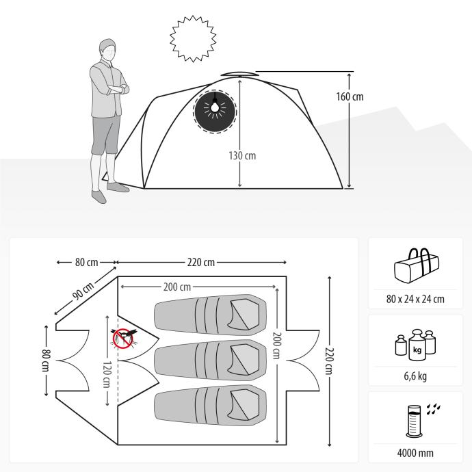 Šotor Quick Oak 3 ponuja dovolj prostora, udobja in tehničnih lastnosti za prijetno kampiranje 2 - 3 oseb. Če bi radi na počitnicah, taborjenju ali festivalu spali pozno v dan, priporočamo serijo Quick Oak 3 Dark Series. Kakovosten material z vodnim stolpcem 4.000 mm je narejen tako, da je v notranjosti šotora tudi ob močnem soncu popolnoma temno. To pomeni, da lahko kadar koli udobno spite v temi, ne da bi se spalnica pregrela. Če želite v šotor spustiti malo svetlobe, lahko preprosto odprete zavese na oknih v predprostoru.