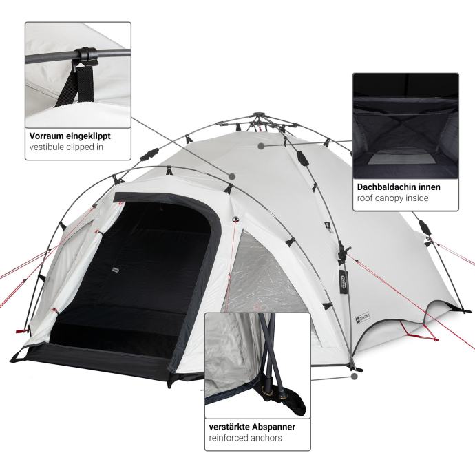Stisnite Quick Up System od spodaj navzgor. Za to ne potrebujete veliko truda, ker se šotor razpre kot dežnik.