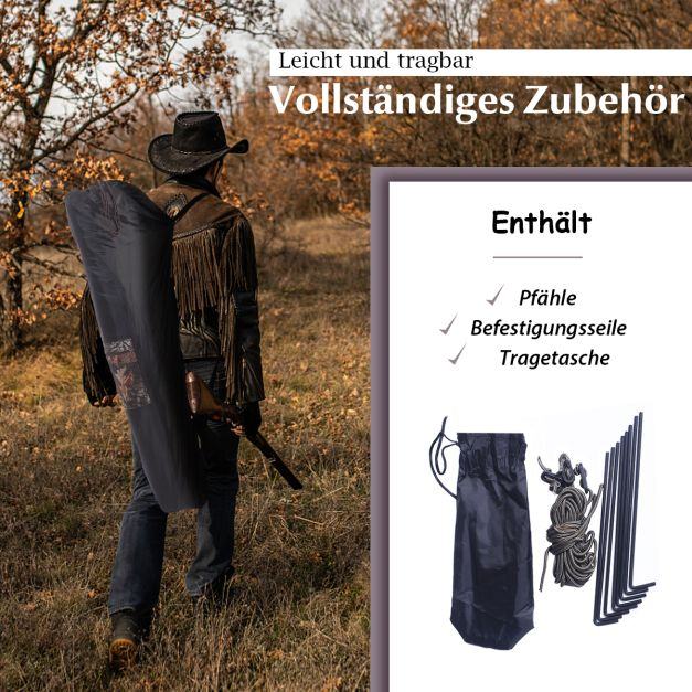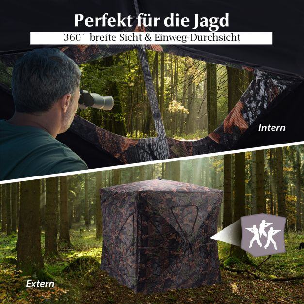 Vsak dober lovec potrebuje dobro lovsko opremo. Ta profesionalna lovska koža se lahko združi z okoliškimi habitati in vam nudi dober pogled na vaš plen. Strelna vrata vam omogočajo prosto streljanje s katere koli strani, kar močno poveča vaš lovski uspeh. Izdelan iz trpežne poliestrske tkanine in steklenih vlaken, je lovski šotor odporen na obrabo in vremenske vplive za uporabo na prostem. Opremljen je s konicami in trakovi za privezovanje, ki povečajo stabilnost in vzdržijo močan veter. Takoj postavite lovski šotor in uživajte v lovu s svojimi partnerji! V šotoru lahko bivajo največ 3 osebe brez omejitev. Po lovu ga shranite v torbo.