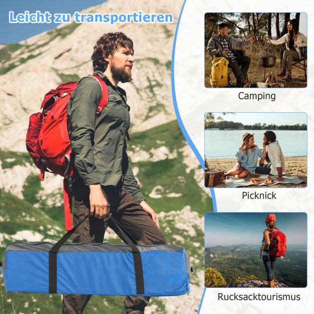 Družinski šotor je narejen iz poliestra, odpornega proti obrabi, zato je narejen tako, da traja. S 1500 mm nepremočljivim premazom je šotor zanesljivo zavetje za na prostem. Šotor za kampiranje ponuja prostorno notranjost, ki lahko udobno sprejme do 3 osebe, zaradi česar je idealen za manjše skupine ali družine. Poleg tega vas zaradi dobro prezračenih oken ne bodo motili nezaželeni gostje. Šotor za kampiranje za 3 osebe ima odstranljivo dežno streho, ki lahko služi tudi kot zavetje na plaži in vam nudi dodatno zaščito. Hkrati je na voljo odstranljiva podloga za obutev, tako da notranjost ostane čista. Podprta s palico iz steklenih vlaken, ki je odporna na razpoke in se ne deformira zlahka, je letna plošča trpežna. Za pritrditev so na voljo vetrne vrvi in talne konice, s katerimi lahko šotor pritrdite na tla za dodatno stabilnost. Končno je lahek šotor enostaven za postavitev in zlaganje. S priloženo prenosno torbo ga lahko priročno vzamete kamor koli.