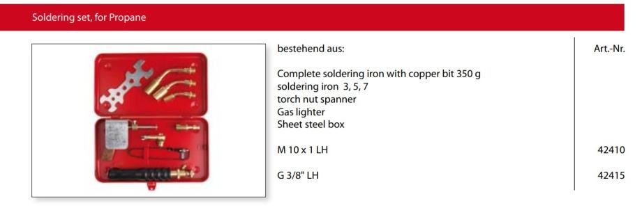 KOMPLET ZA MEHKO SPAJKANJE - PROPAN. Vsebuje: spajkalnik s 350 g bakrenim kosom, plamenice velikosti 3, 5 in 7, ključ za gorilnik, plinski vžigalnik, ohišje iz jeklene pločevine.