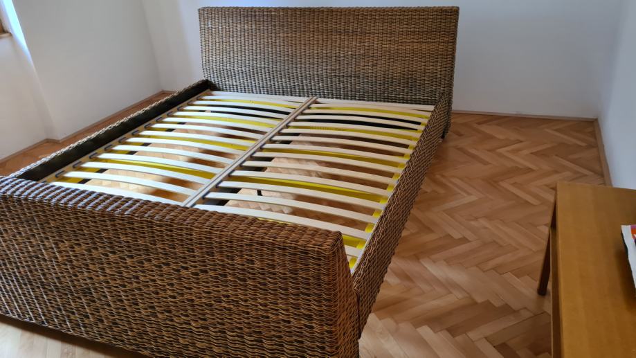 Postelja je enostavno sestavljiva in je iz ratana, zaščitena z brezbarvnim lakom na vodni osnovi. V kompletu z 2 nočnima omaricama v enakem ratanu in ledvenima vložkoma. Vse kit novo.