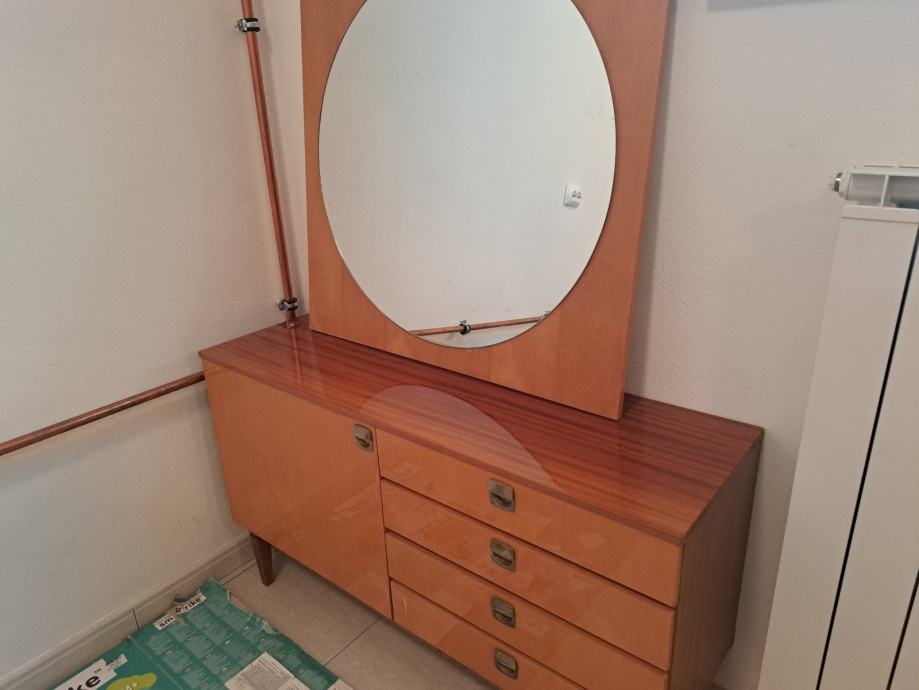 Komplet obsega zakonsko posteljo z dvema jogijema (180x190 cm), dve nočni omarici, ogledalo, komodo in trodelno omaro (razstavljeno - vrata omare na priloženi sliki).