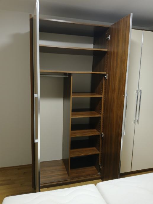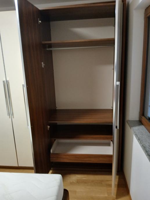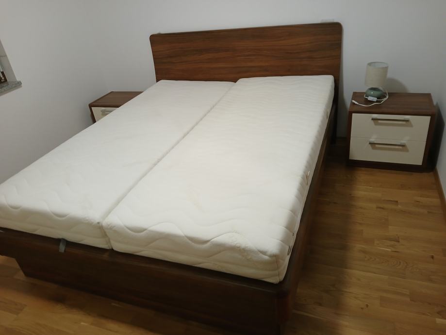 Komplet spalnica, omara (3000x2300mm) z predalnikom, postelja (1600x2000mm) z letvenim dnom in vzmetnicama ter obe nočni omarici.
