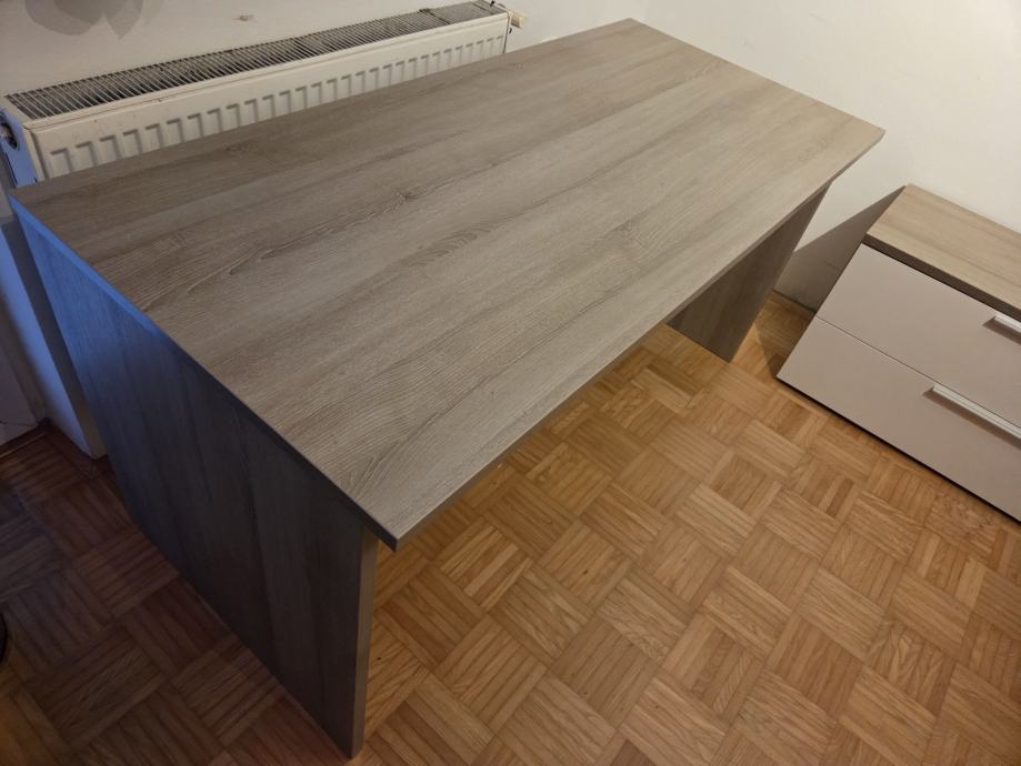 Komplet vsebuje veliko omaro (150x60x220), predalnik (100x40x100), omara za knjige (100x38x50), komoda (100x40x50) in miza (150x70x75).