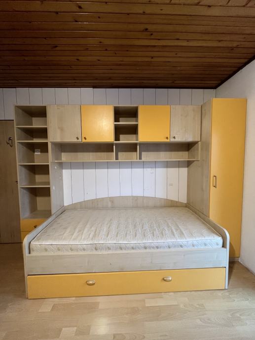 Otroška soba z jogijem, ležišče 200×900, stranske omarice 45cm široke in 210cm visoke, pod posteljo je predal za shranjevanje.
