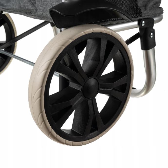 Voziček je opremljen z mehkimi in trpežnimi kolesi, ki omogočajo tiho in gladko premikanje po vseh vrstah površin. Kolesa so zasnovana tako, da zmanjšujejo tresljaje in omogočajo enostavno vlečenje, tudi ko je voziček polno naložen do njegove nosilnosti 30 kg.
