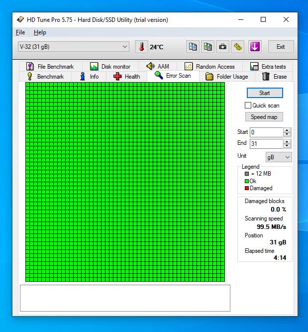 Prodam rabljeni SSD trdi disk znamke KingSpec z kapaciteto 32GB. Pri uporabi diska nisem imel nobenih težav, pri skeniranju diska s programom HD Tune ni javilo nobenih napak oziroma slabih sektorjev.